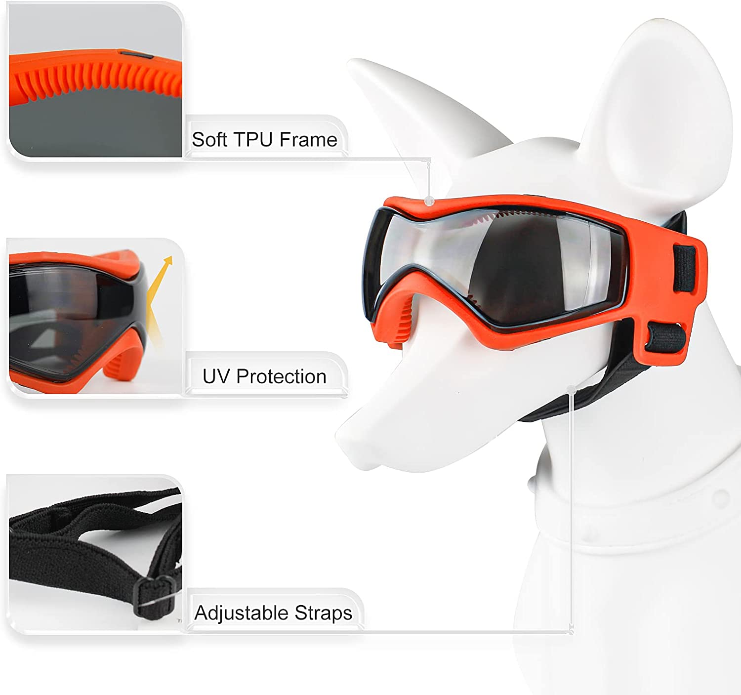 - Soft frame pad around inside the glasses for comfort and skin-friendly. Spacious interior structure won't press against your dog eyes. Fully enclosed goggles would make pet eyes won’t get wind, dirt, sand damaged or whatever else may fly through the air.