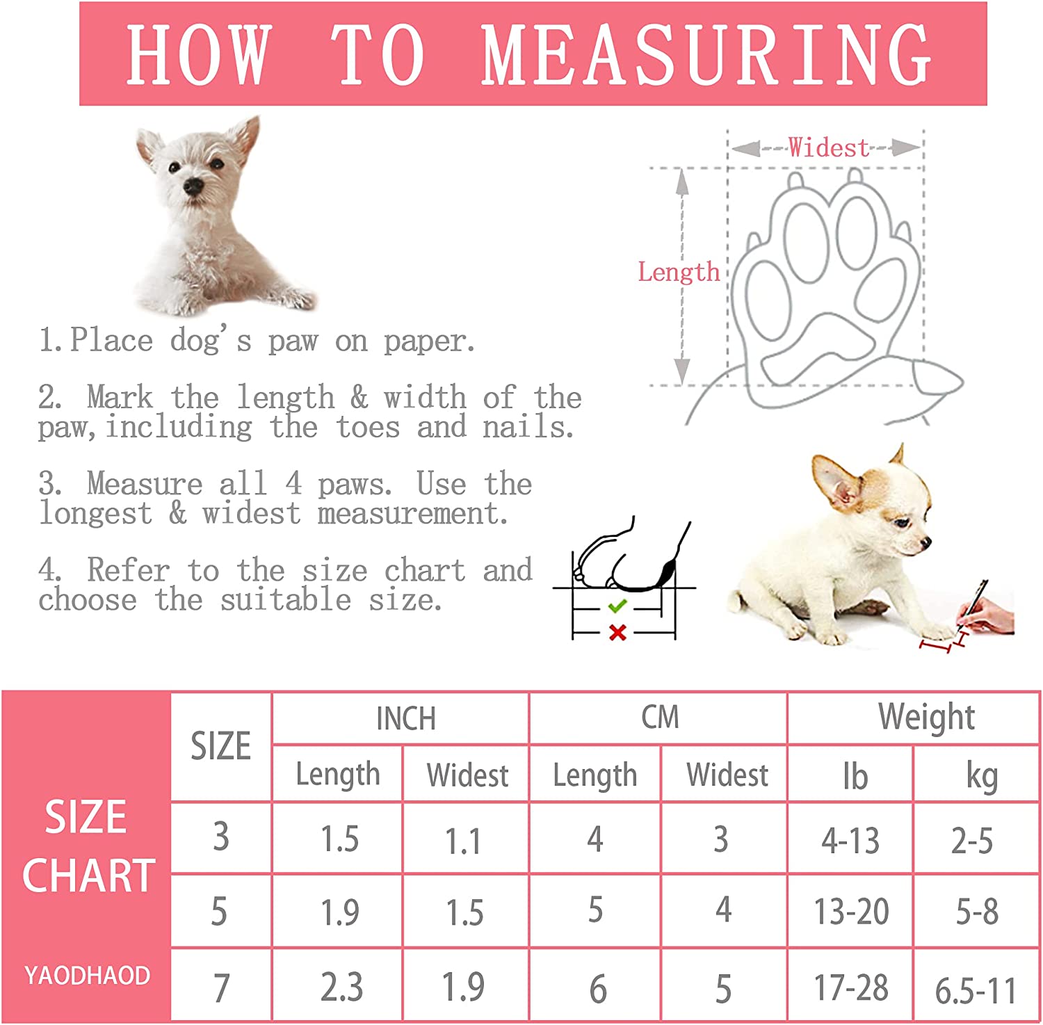 - 1.【Sizes】:Size 3: 1.5" x 1.3" (L*W);Size 5: 1.9" x 1.5" (L*W);Size 7: 2.3" x 1.9" (L*W). Please measure your dog's feet before ordering.Then choose the right size to buy.The size in the page is the length and width of the inside of the shoe.When the parameters come out,please match the size and choose a size measurement that is larger than you.So your cute dog will wear it more comfortably.