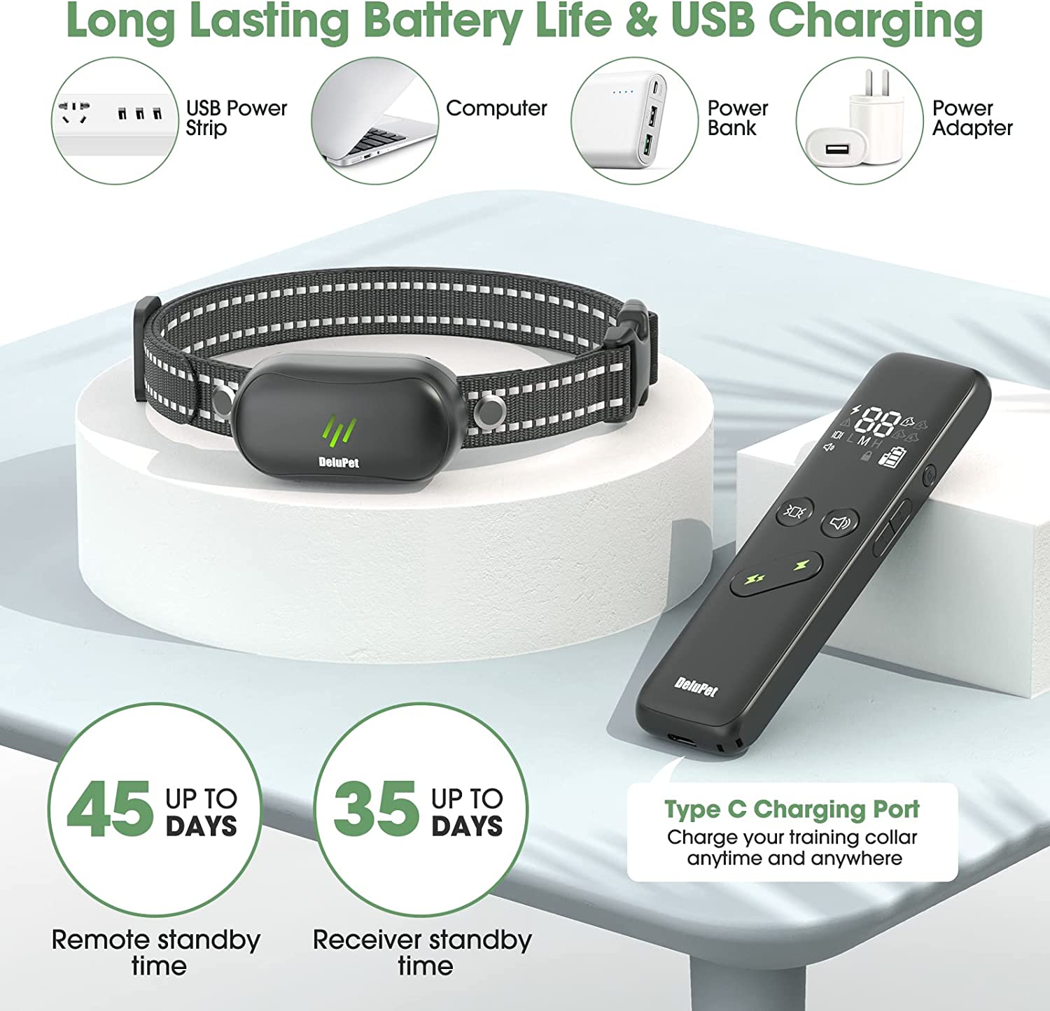 - 【Effective Training Collar for Dogs】Featuring 3 safe modes: Beep, Vibrate and Shock, DeluPet shock collar enables you to customize the suitable stimulation levels for your furry friend, useful in discouraging dogs from bad behaviors.