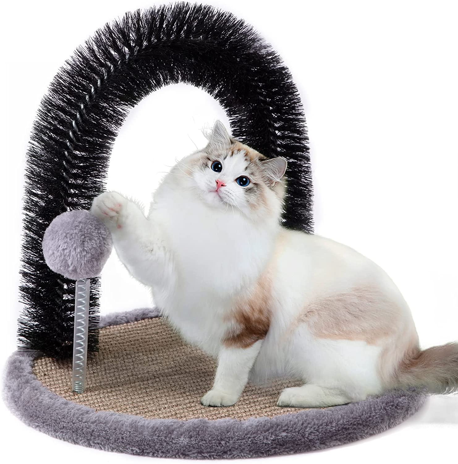 - šŗ CAT TOY BALL AND GROOM ARCH KEEP CATS ENTERTAINED - The fuzzy ball and groom arch of the scratching pad keep feline friends entertained and busy for hours while giving them an easy way to groom themselves at any time. Minimize nail files and loose hair with this grooming station.