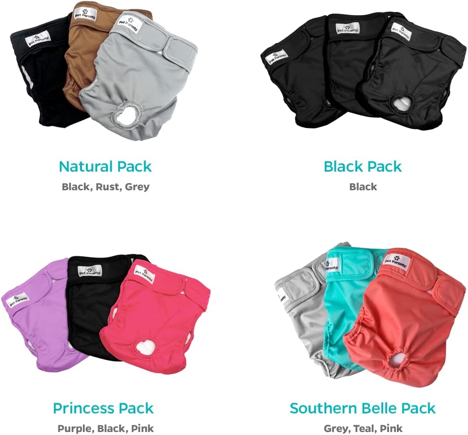 - 3 WASHABLE DOG DIAPERS IN 3 COLORS PER PACKAGE - One each of PINK, TEAL, and GREY. These washable doggy diapers are more economical and environmentally friendly than the disposable dog diapers.