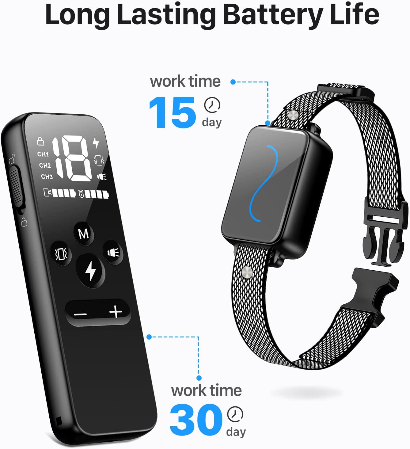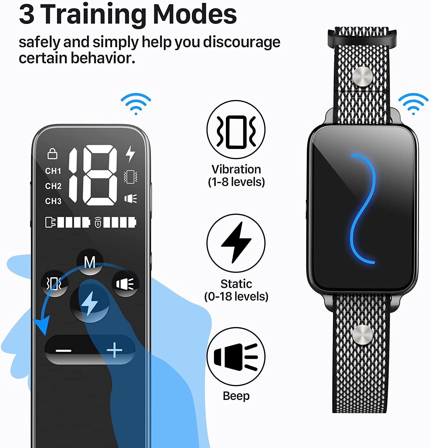 - 3 Safe and Humane Training Modes: Beep, Vibration(1-8 levels) and Static(0-18 levels). The remote also come with a safety lock, efficiently prevent your dog from unnecessary punishment due to misoperation.