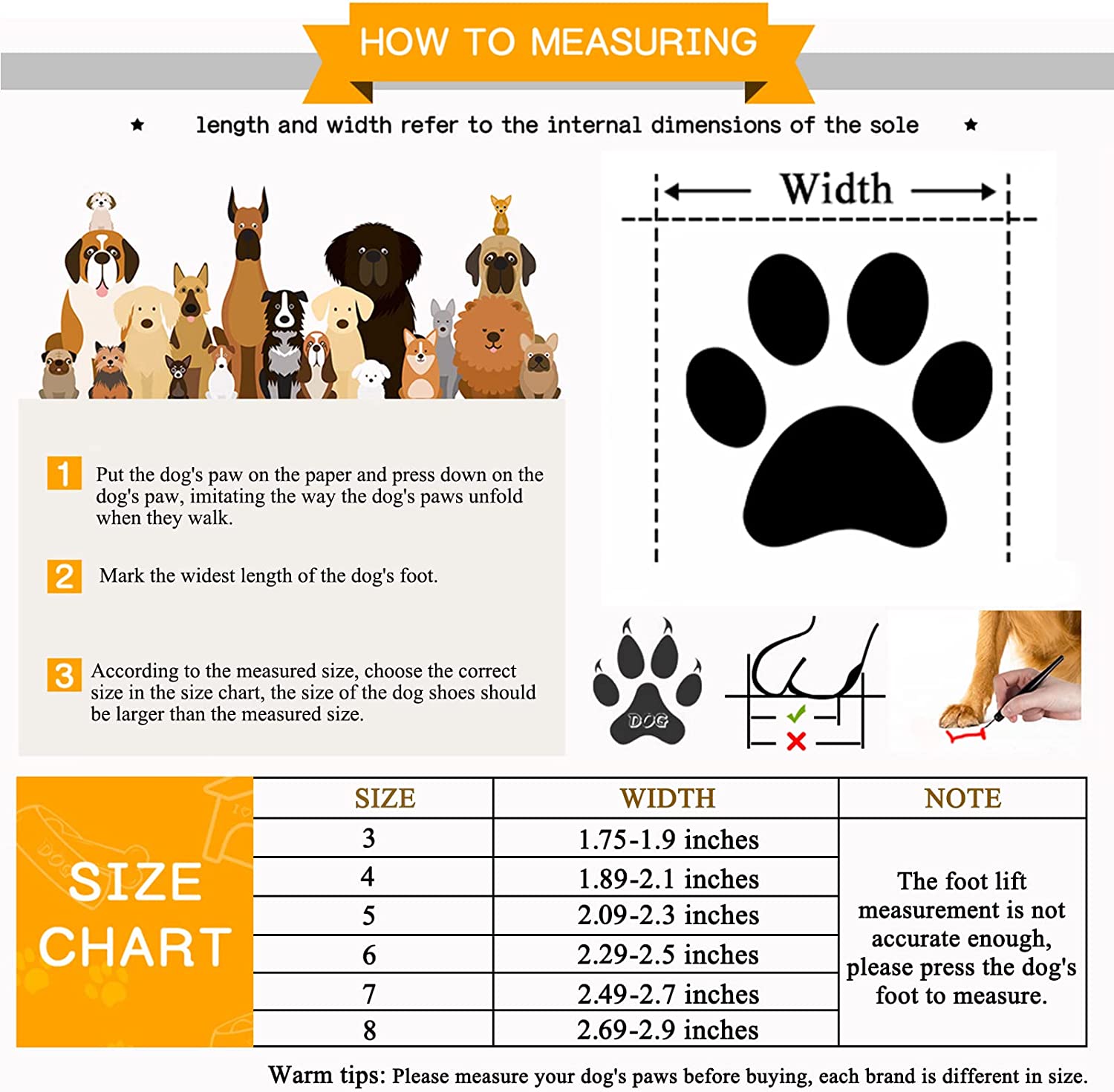 - 【Size Selection】Size 3: 2.5''x1.9''(L*W) for 24-30lbs (Note: If the dog foot size is 1.9" wide, please buy size 4. The weight is only for reference, please measure the dog's paw size before choosing suitable dog shoes, If your dog's paw is smaller than the smallest size in our size chart, please purchase our products with caution. Our smallest size is size 3, there is no smaller size) Great for Poodle; Schnauzer; Pug; West Highland Terrier; Corgi etc small medium dog.